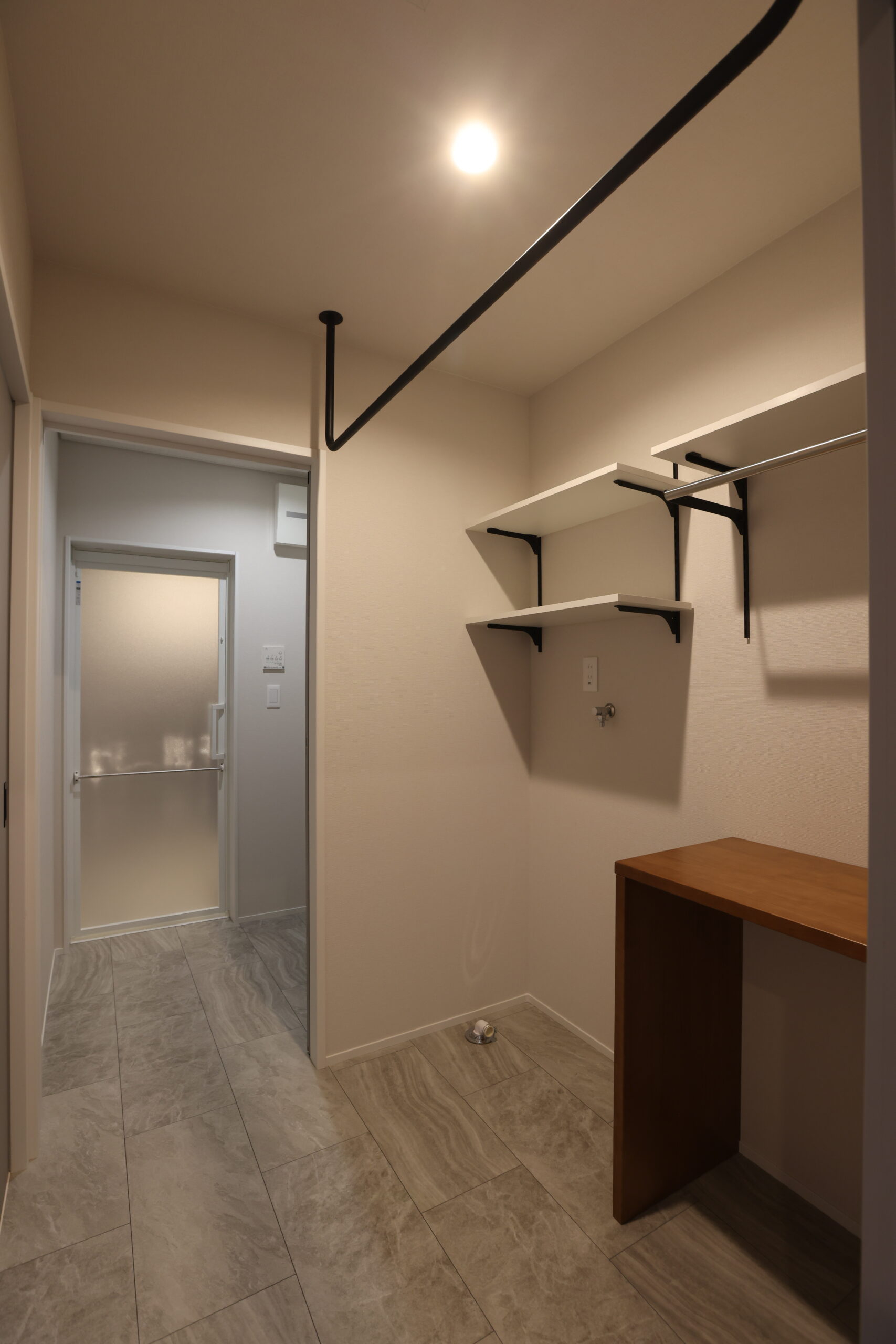 賃貸物件のクッションフロアにありがちな、テカテカした安っぽいプリント柄とは一線を画します。フロアタイルは表面の凹凸(エンボス加工)まで緻密に計算されています。 本物の大理石やセラミックタイルのような重厚感、使い込まれた古材のような質感。洗面室のドアを開けた瞬間、そこが「単なる水回り」ではなく「デザインされた居住空間」であることを実感させてくれます。