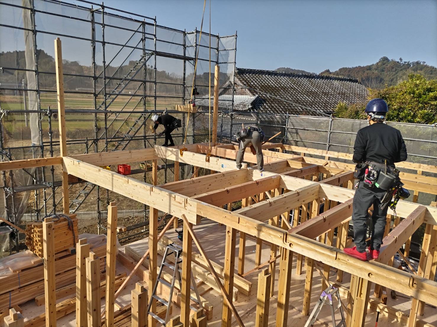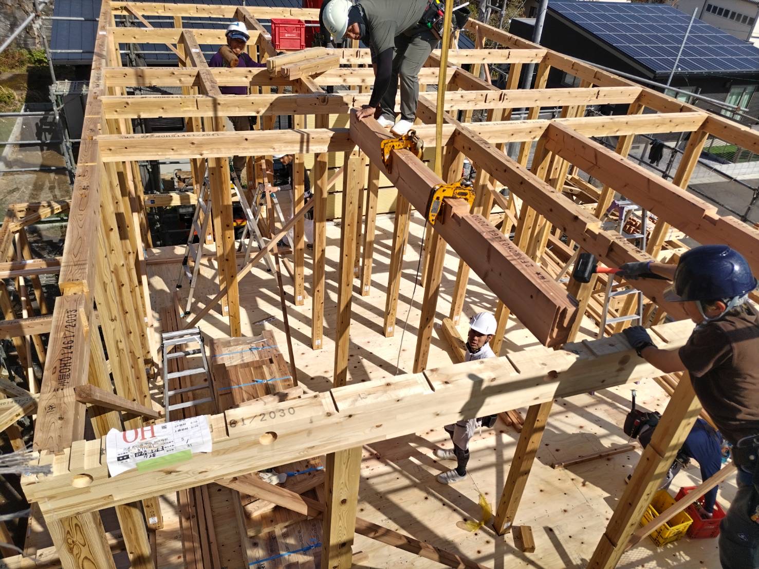2階部分まで一気に組み上がり、家の骨組みが見えてくると、お施主様の夢がぐっと形に近づいた実感が湧いてきます。