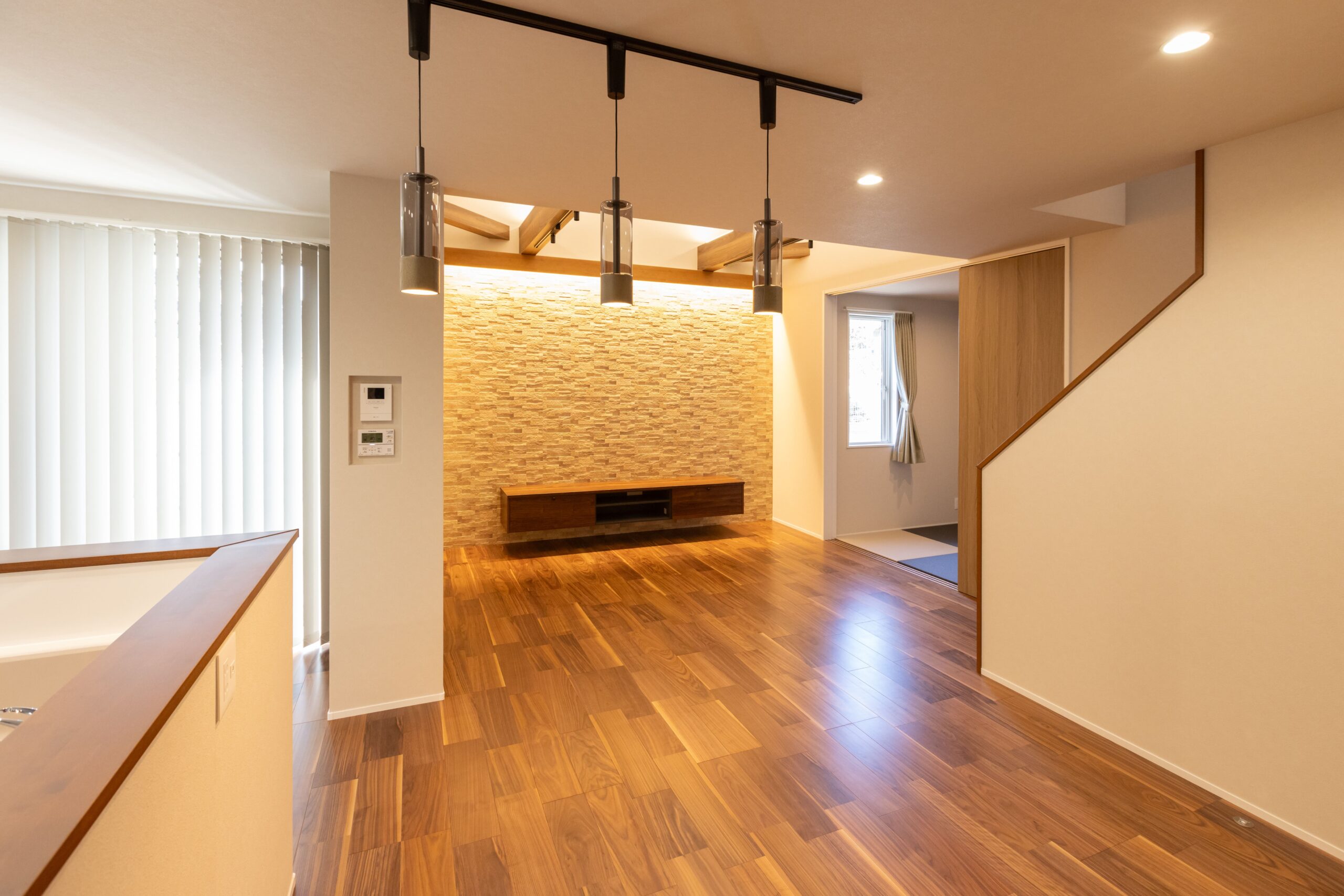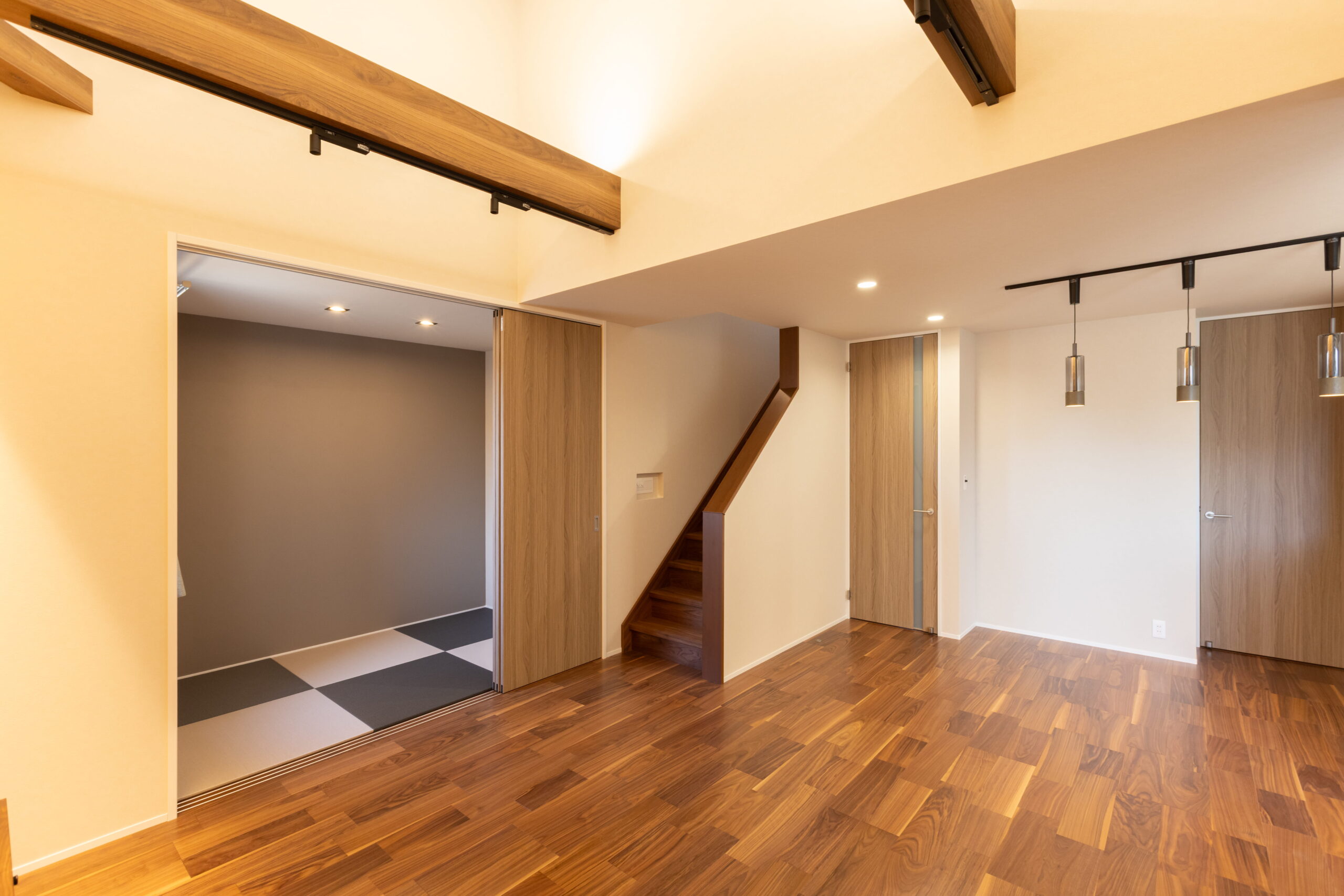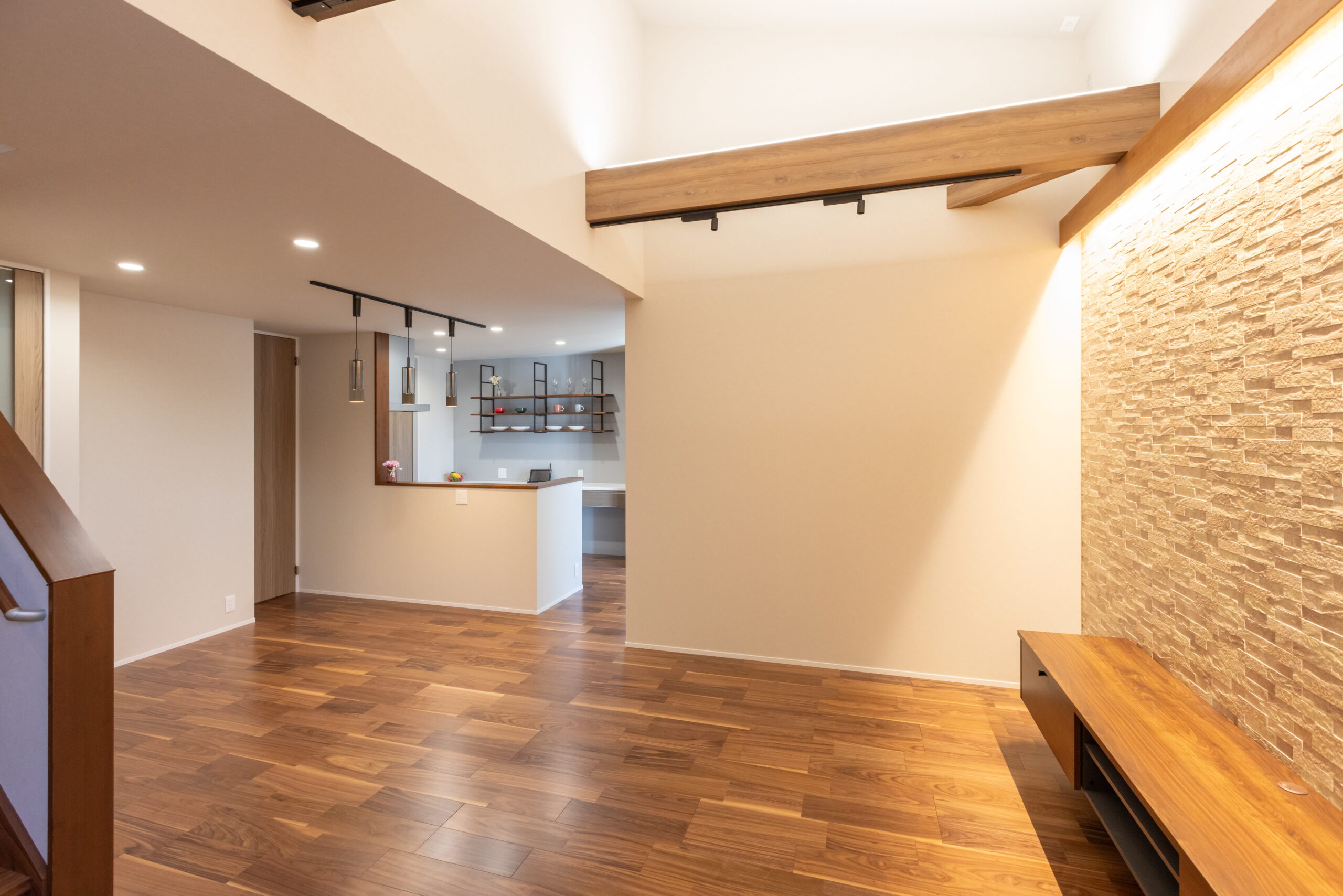 室内は天井高と梁を活かした開放的な空間構成で、視線の広がりを演出しています。